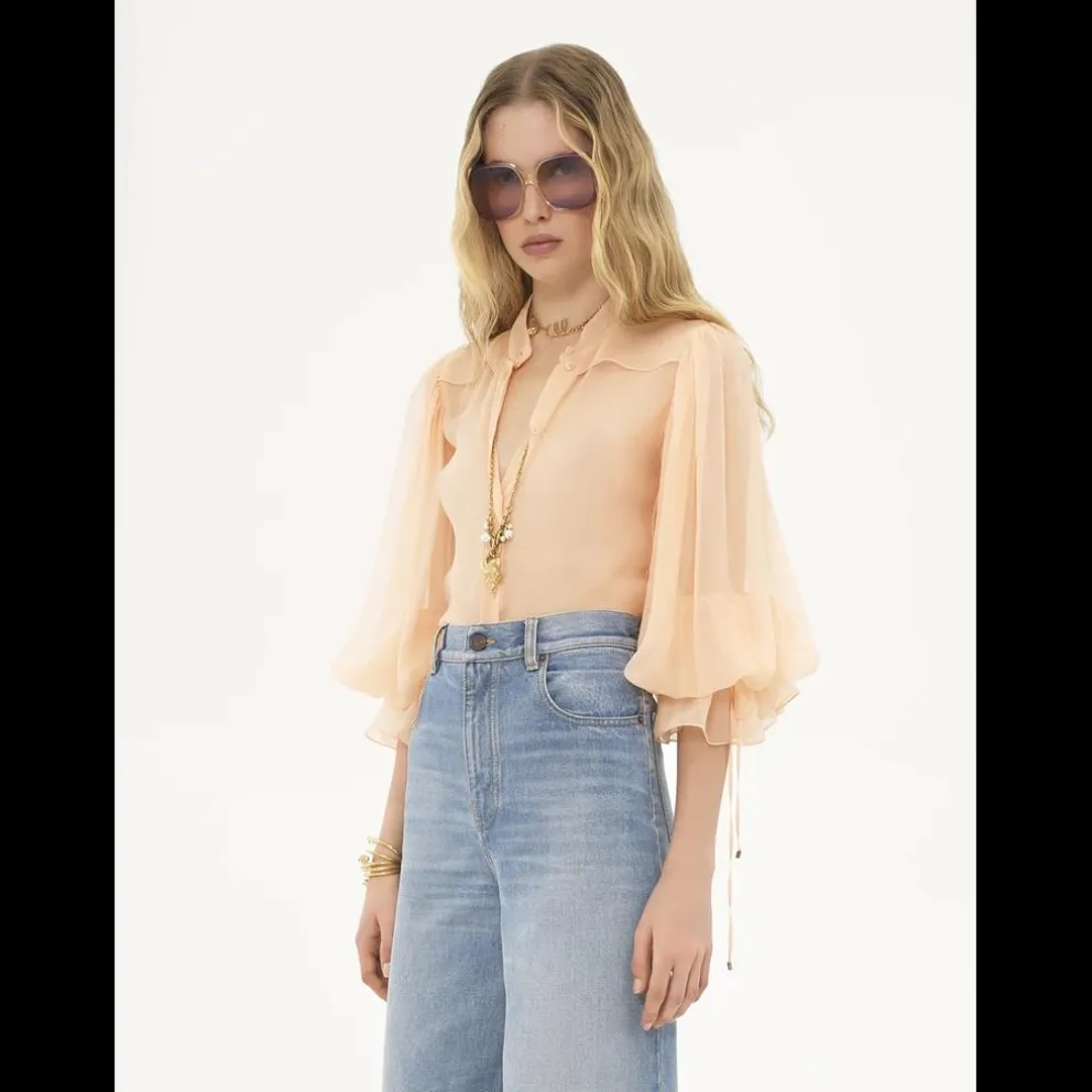 Blusa transparente de mangas bufantes em mousseline de seda orgânica com forro de seda, detalhada com botões de madrepérola e punhos franzidos. Gravatas pendentes com pontas de metal dourado finalizam esta peça.