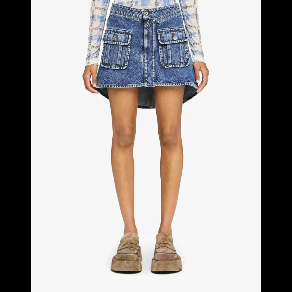 MINISAIA COM BOLSO CURVADO. Minissaia de ganga completa com silhueta evasé. Bolso frontal com pala. Bolsos traseiros traseiros Cintura assimétrica