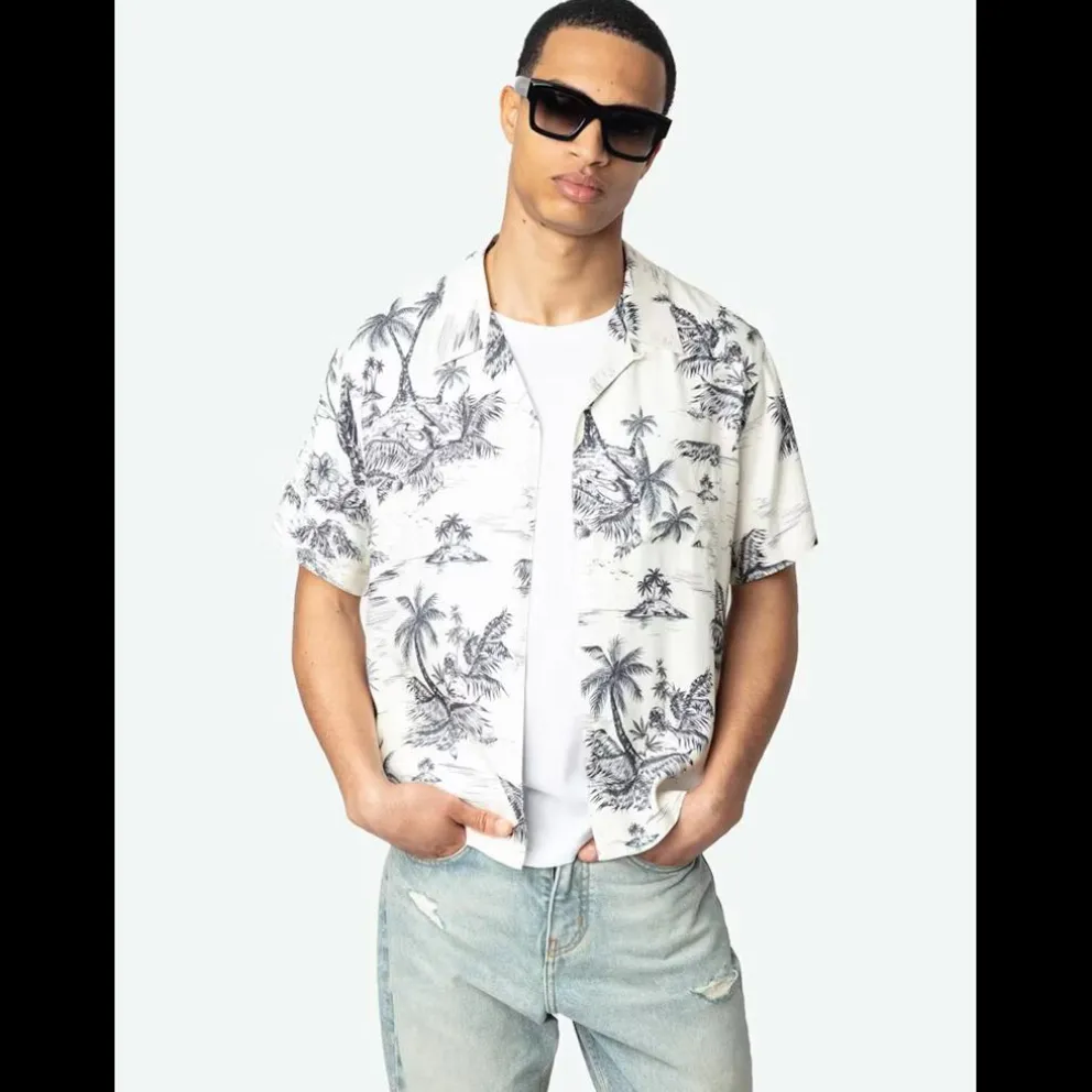 Camisa casual em viscose estampada com bordado de asas, manga curta e fecho de botões. 55% RAYON 45% VISCOSE