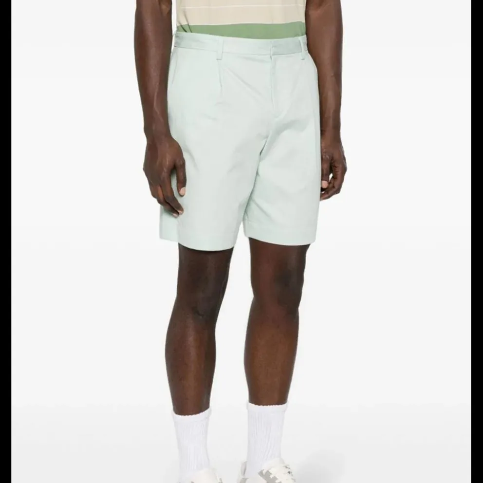 shorts plissados de algodão Destaques Chá verde algodão presilhas para cinto detalhe de pregas dois bolsos diagonais nas laterais dois bolsos traseiros debruados botão frontal oculto, fecho de gancho e fecho