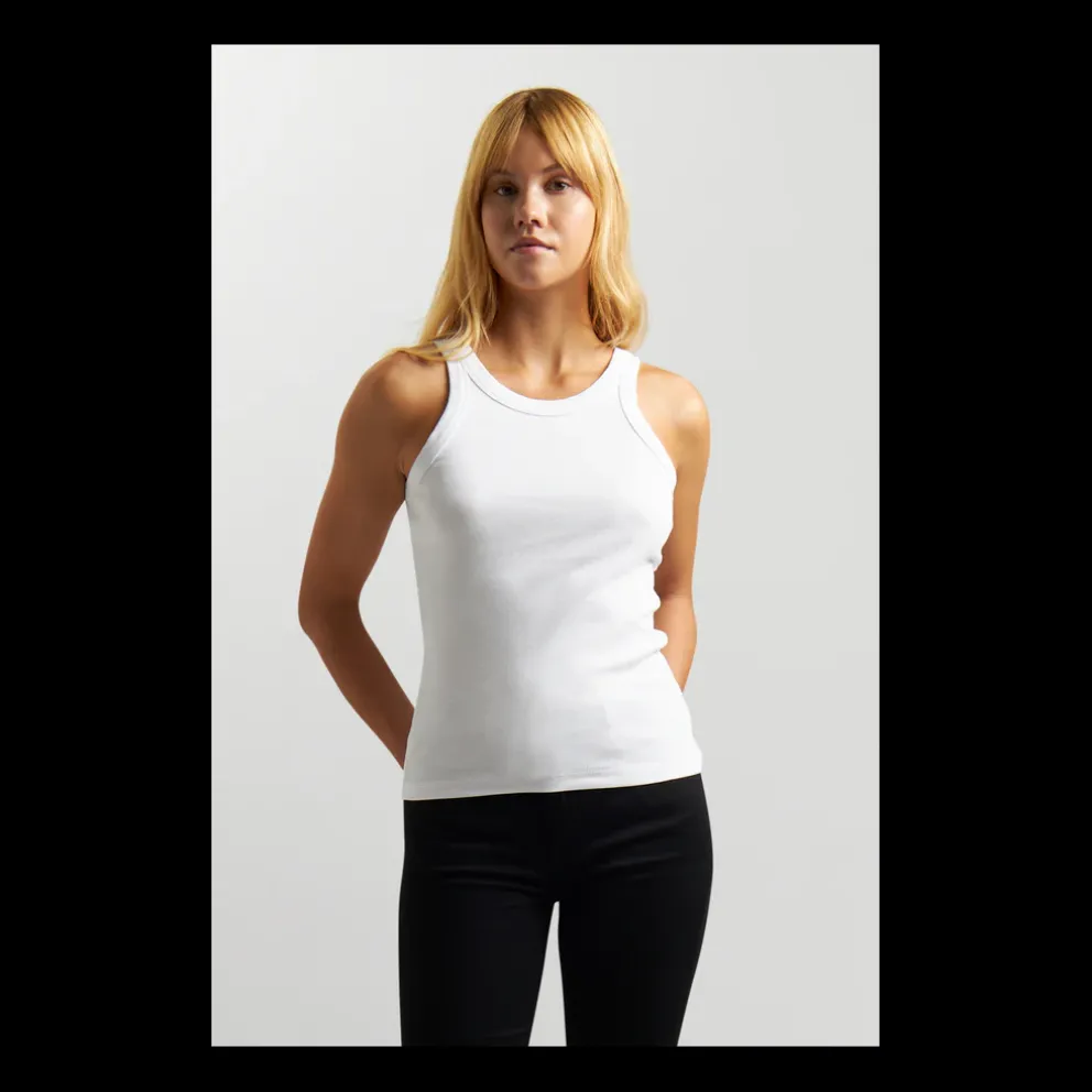 O top Faro apresenta um corte justo com malha canelada justa, misturada com algodão e viscose para respirabilidade e suavidade adicional 85% algodão, 9% viscose, 6% elastano