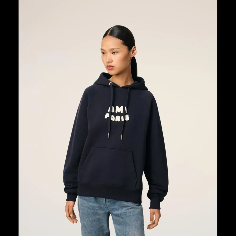 Sweatshirt com capuz Ami Paris em lã de algodão orgânico loopback. Ajuste quadrado. Produto unissexo. Patch de malha “Ami Paris”. Bordado tonal “AMI” nas costas. Mangas raglan. Pontas de metal na cor níquel e ilhós gravados com “ami”