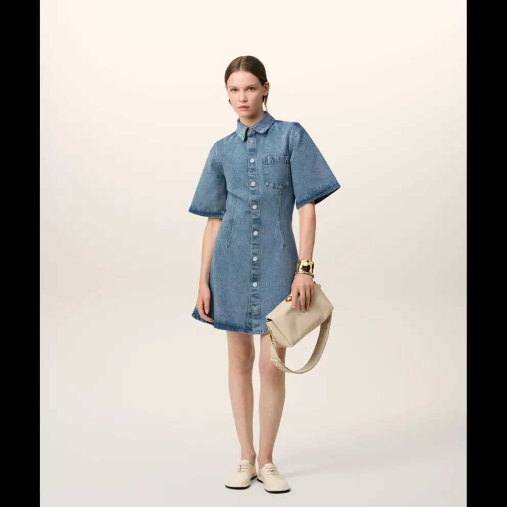 Vestido camiseiro de manga curta em ganga índigo usado. Ajuste ajustado. Bolso no peito Rebite Ami de Coeur no bolso do peito. Botões de pressão em ganga na cor níquel