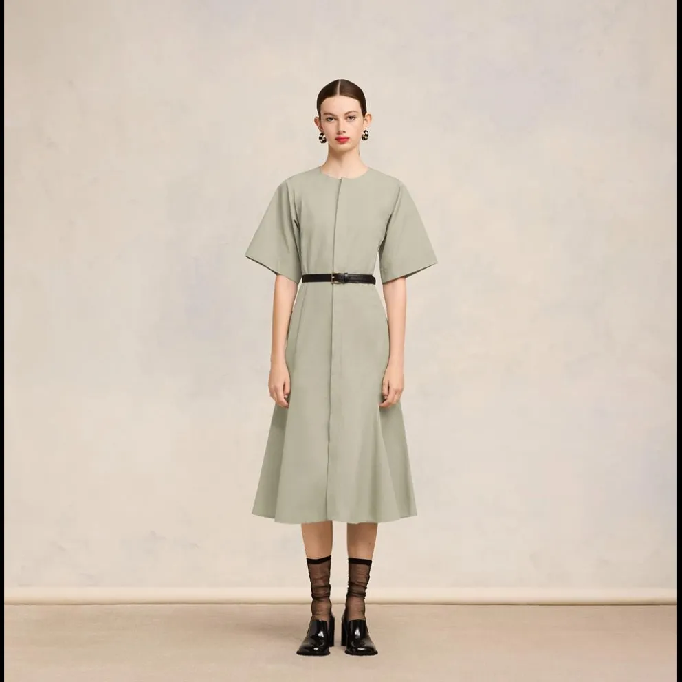 Vestido midi Godet com aba oculta em popeline de algodão. ?