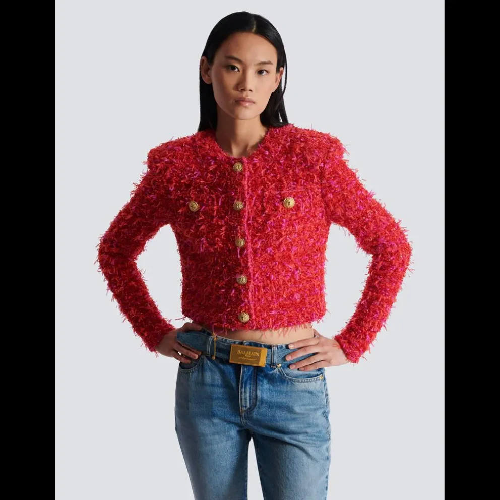 Casaco recortado de tweed. Casaco de tweed com textura brilhante Decote redondo Ombros estruturados Mangas compridas 2 bolsos falsos com botões decorativos Fixação frontal com 5 botões de pressão Botões “Double Chain Lion” em metal dourado