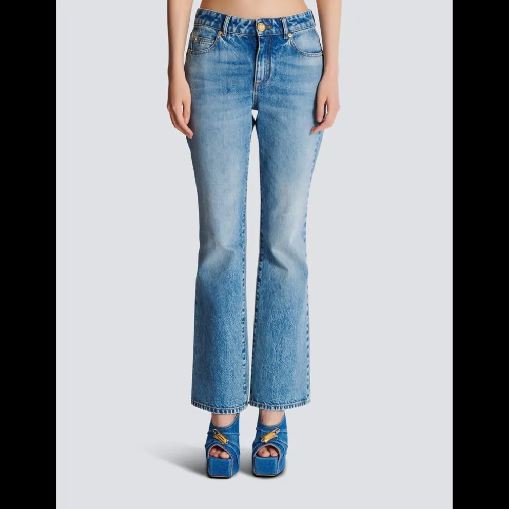 Flared denim jeans. Cós com presilhas e presilha tripla na parte de trás