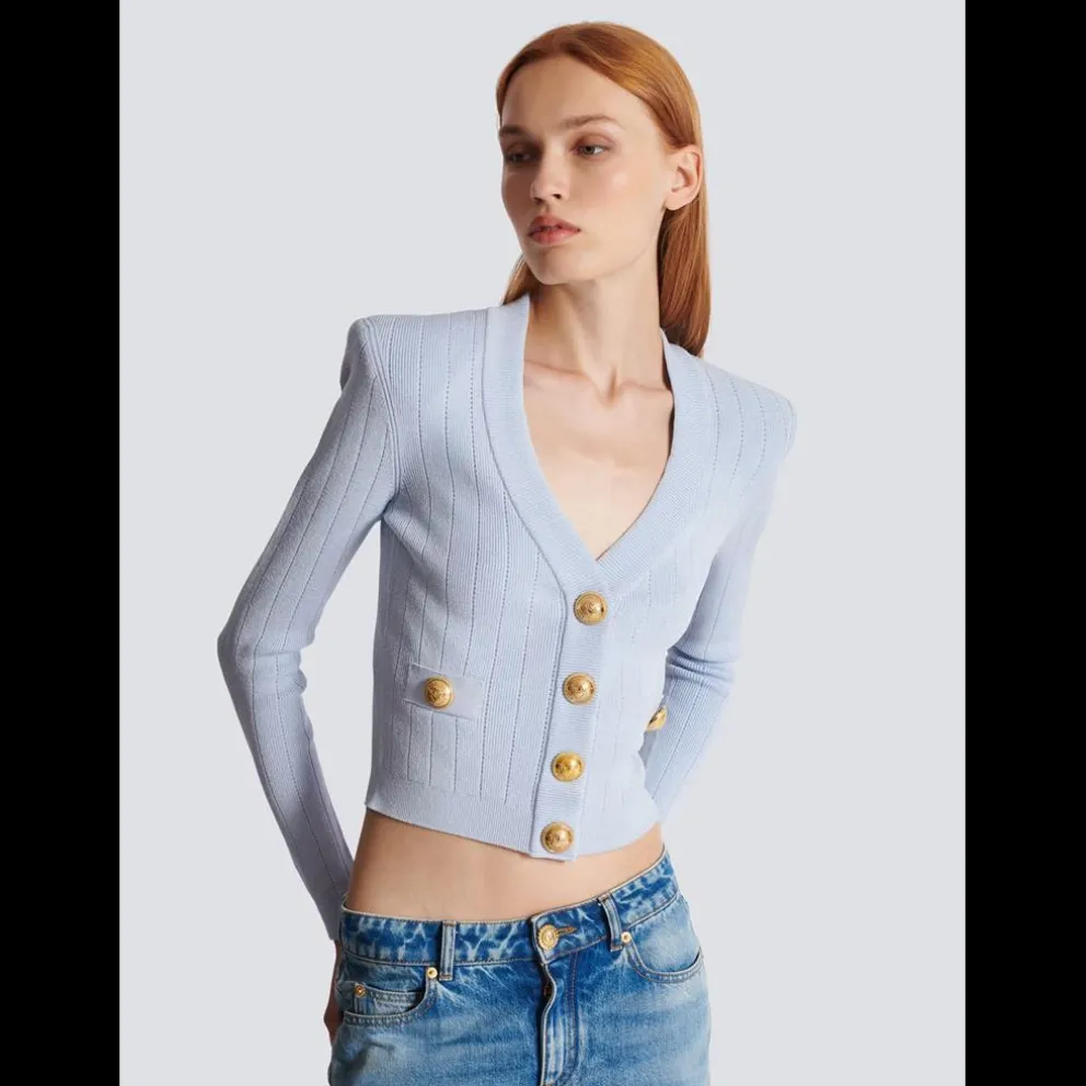 Cardigan de malha canelada fina com botões Corte justo Decote em V Ombros estruturados, mangas compridas. 83% viscose 17% polyester
