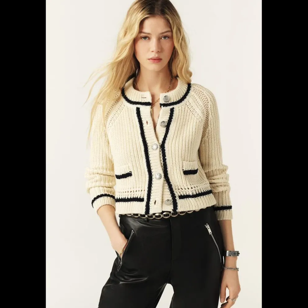 Corte curto – Mangas compridas – Gola redonda – Fecho de botões – Bolsos frontais falsos – Material de malha