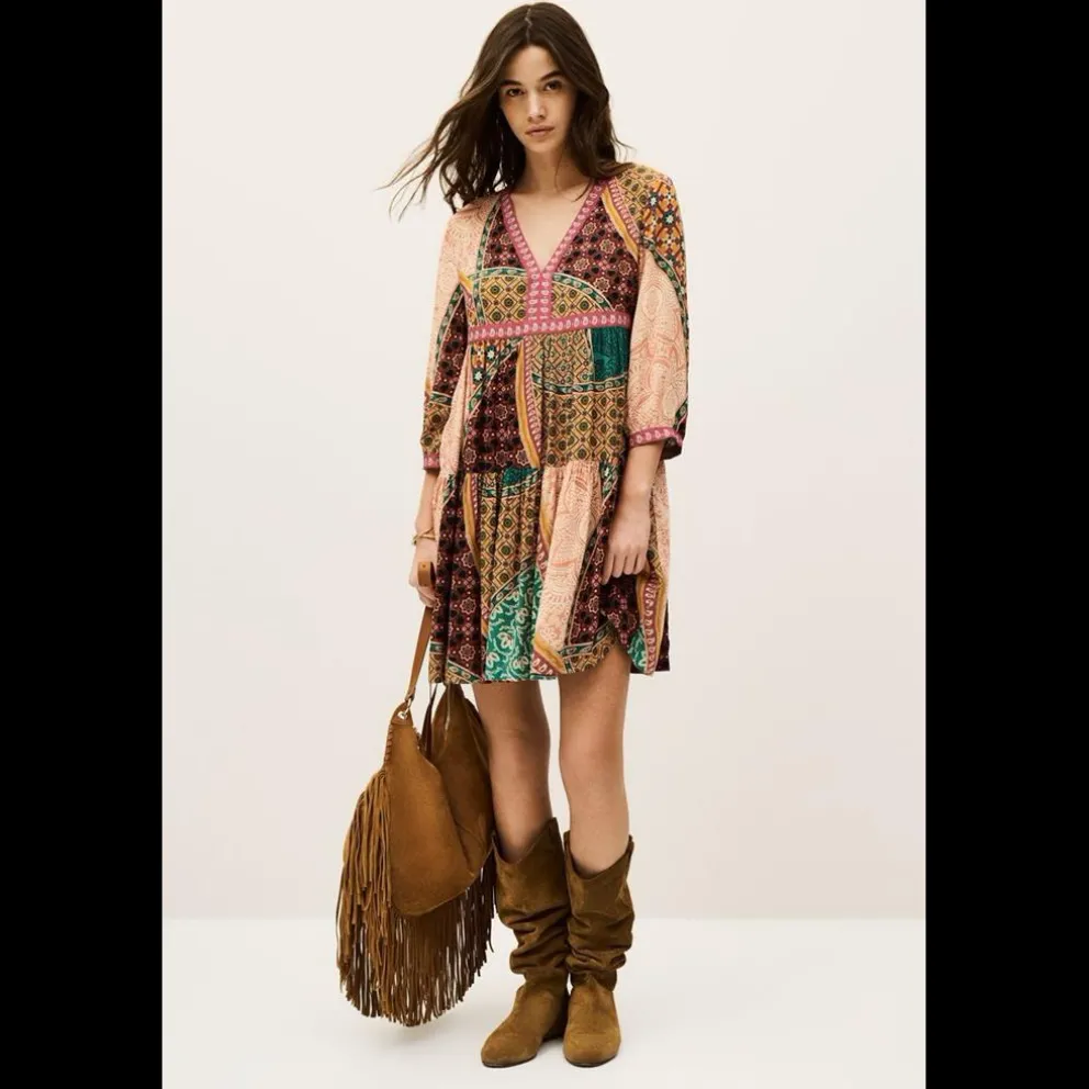 – Vestido curto e justo – Estilo boho chique – Estilo anos 70 – Decote em V – Mangas médias – Cintura subtilmente acentuada por detalhes abaixo do busto – Estilo fluido