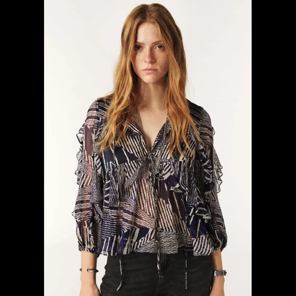 Corte curto – Detalhes de babados – Gola tunisina – Laços de louvor no decote – Efeitos transparentes – Mangas 3/4 efeito balão – Prende-se na parte inferior das mangas – Tecido fluido