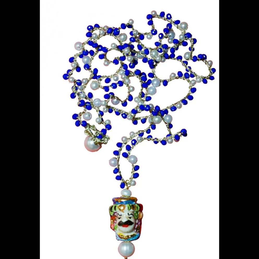 Corrente tecida à mão com fio de ouro. Pedra de zircónia colorida e pérolas. “Testa di Moro” feita de cerâmica siciliana de Caltagirone e pérola natural. Pode usá-lo curto ou longo. A cabeça tem 4 cm e a corrente tem 60 cm de comprimento.