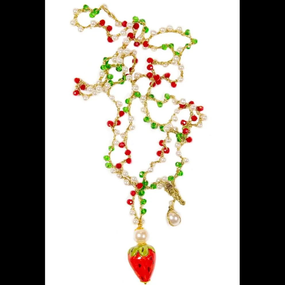 Corrente tecida à mão com fio de ouro. Pedra zircónia colorida e pérolas. Morango em cerâmica siciliana de Caltagirone. Pode ser usado curto ou comprido. O morango mede 4 cm e a corrente 60 cm.
