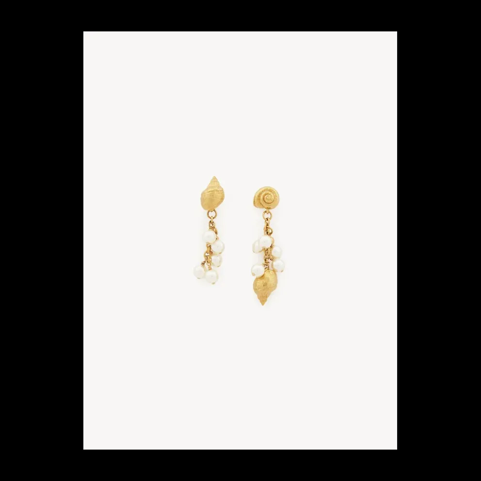 Brincos pequenos pendentes Chloé Shells em latão dourado vintage. Um total de três conchas e diversas pérolas sintéticas embelezam o design assimétrico, assinado por uma gravação do logótipo da Chloé.
