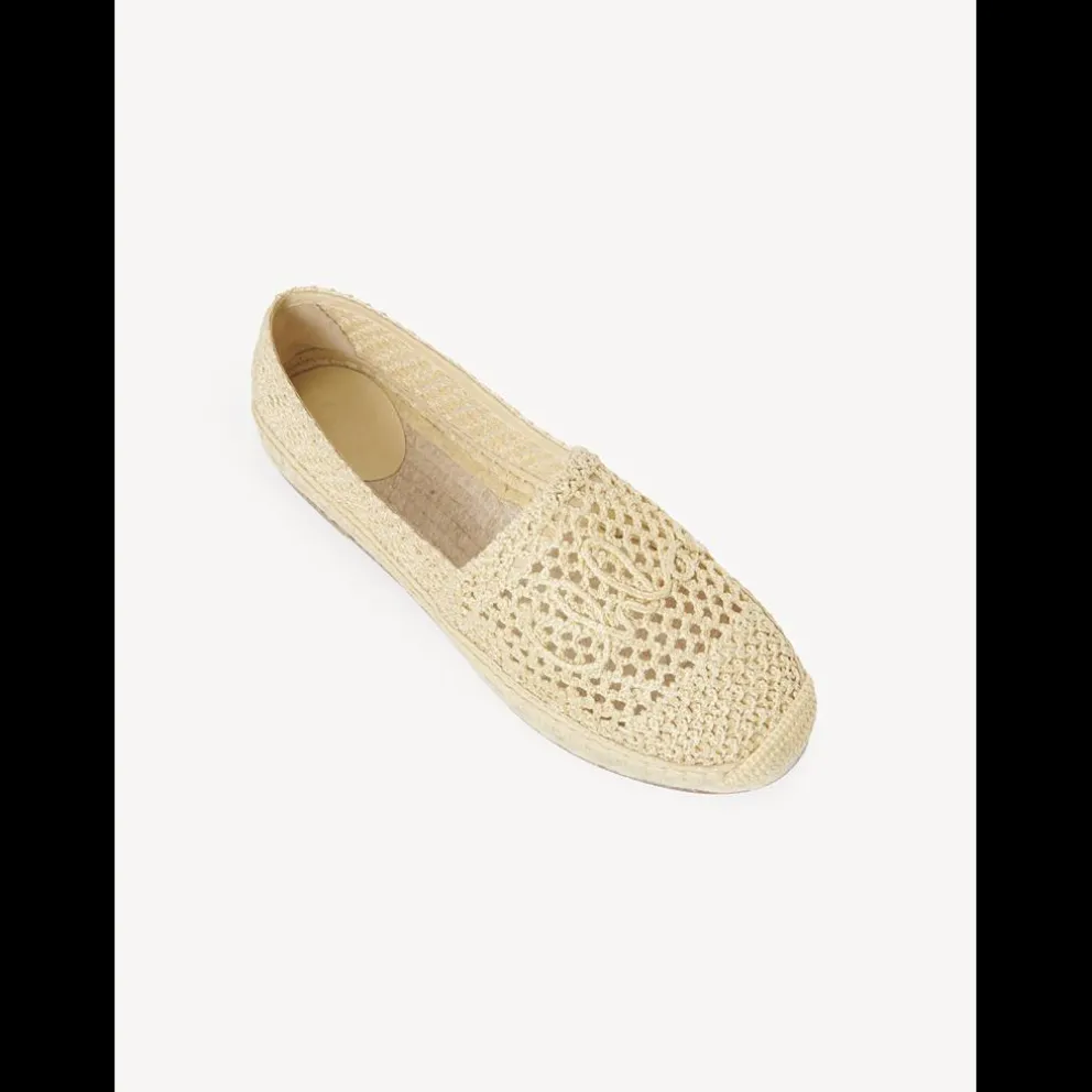 Feitas em croché, as alpercatas Isla são feitas sobre uma sola de cordão natural. A frente é bordada com uma assinatura manuscrita inspirada num cinto vintage da Chloé.