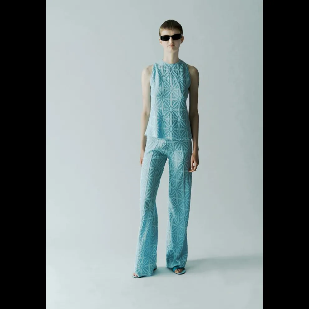 TOP COM ALÇAS E DETALHES DE JÓIAS, PADRÃO JACQUARD MAJOLICA TOM SOBRE TOM COM TEXTURA 3D.