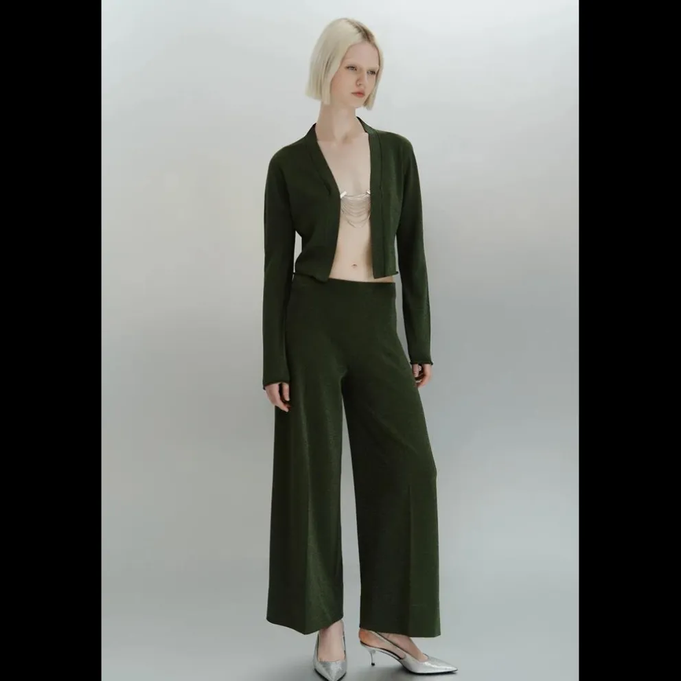CALÇAS CROPPED LAMÃ, PERNA LARGA, CINTURA MÉDIA. 55% VISCOSE 25% POLIAMIDA 13% METAL 7% POLIÉSTER