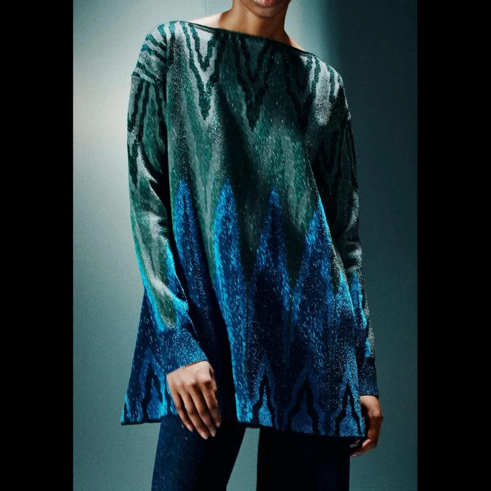CAMISOLA COM PESCOÇO BARCO COM DESENHO GEOMÉTRICO EM LAMÉ JACQUARD, OMBRO CAÍDO, GRANDE AJUSTE