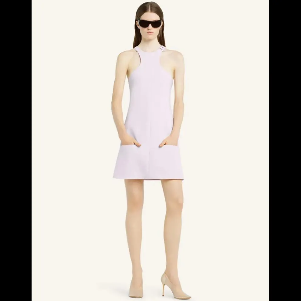 Vestido curto, sem mangas, estilo A, com costas nadador e detalhe de botões na alça. Fecho de correr e dois bolsos frontais de debrum.