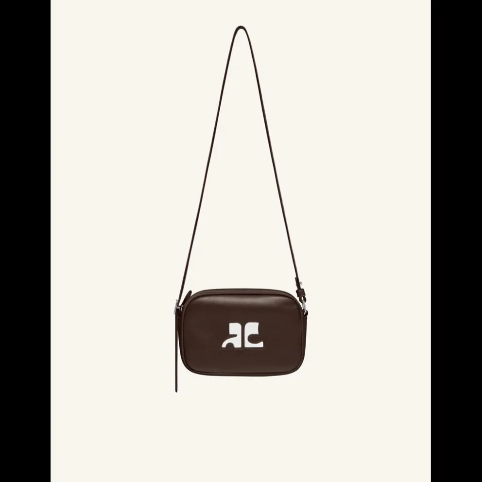 REEDITION LEATHER CAMERA BAG. Bolsa icónica para câmara em pele lisa com bolso interior e alça de ombro ajustável. Logótipo AC branco na frente. Comprimento: 17,5 cm Altura: 12 cm