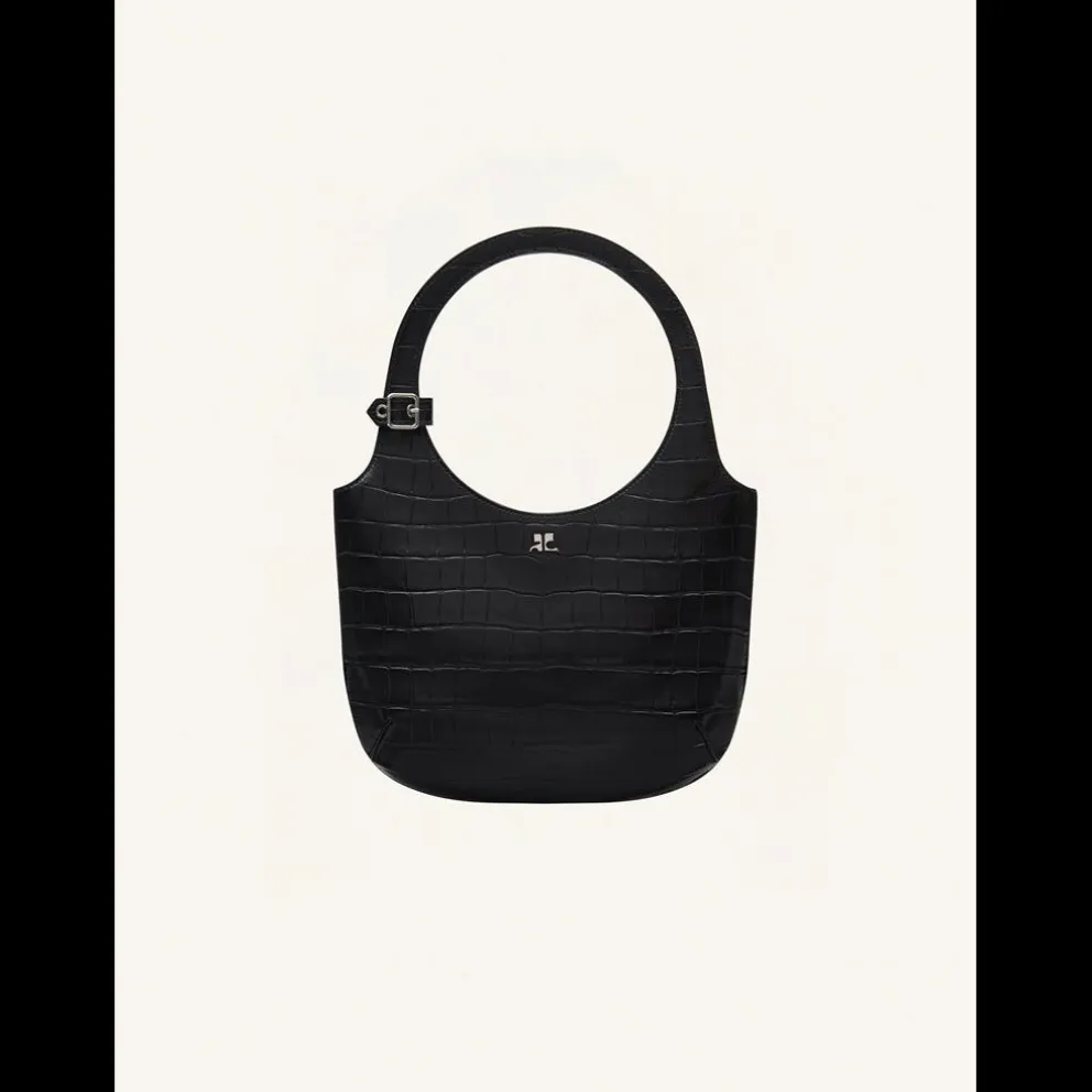 HOLY CROCO STAMPED BAG. Bolsa de couro com relevo croco, fecho de pressão com logotipo AC em metal, detalhe de fivela na alça, bolso interno de couro, alça de ombro ajustável e removível. Logotipo Courrèges gravado na frente. 19 cm x 34 cm x 24 cm