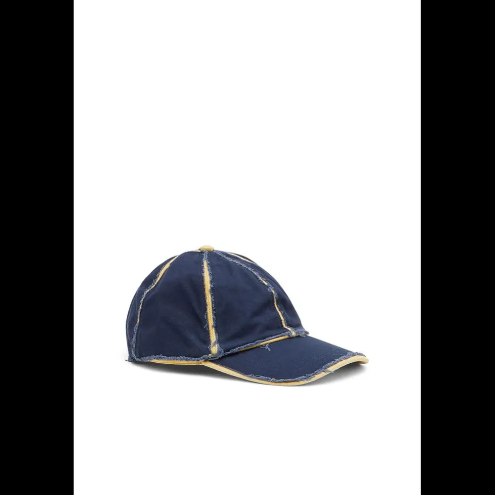 Construído em sarja de algodão stonewashed, este boné masculino tem camadas de painéis contrastantes com bordas cortadas em bruto. Marca com um logotipo D bordado.