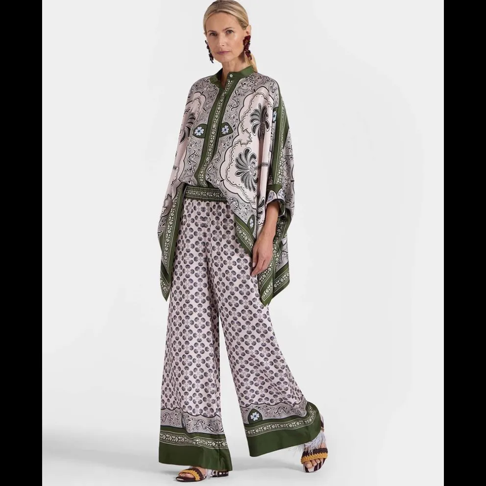 As calças têm uma cintura larga e um corte largo, com um corte largo e arejado nas pernas 聳 como uma saia, mas com o conforto das calças. Uma bela adição ao guarda-roupa com este estampado Mirage chique feito à mão.