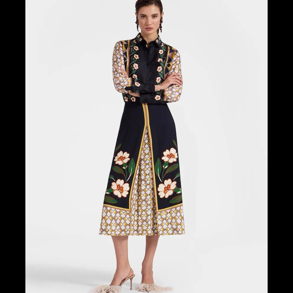 Cortada no nosso sablé de cetim super luxuoso, a nossa saia Santa Monica é uma delícia de dar uma volta, especialmente neste estampado Dazed posicionado com precisão.