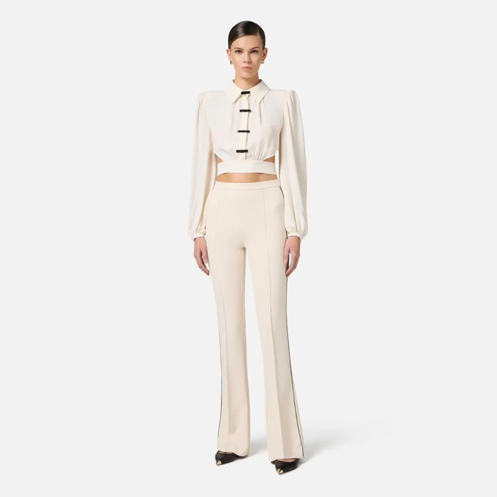 Calças leves de crepe stretch com cós e perna alargada na parte inferior. Os detalhes de debrum contrastante nos quadris e nas abas traseiras dão um toque gráfico à peça. Logotipo bordado em linha em uma aba.