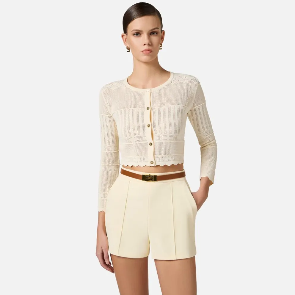 Cardigan de malha com mangas ¾. O elaborado vazado é feito com ponto renda e alterna logomania e desenhos de faixas geométricas ao longo de todo o comprimento. Fecho de botão. Corte slim.