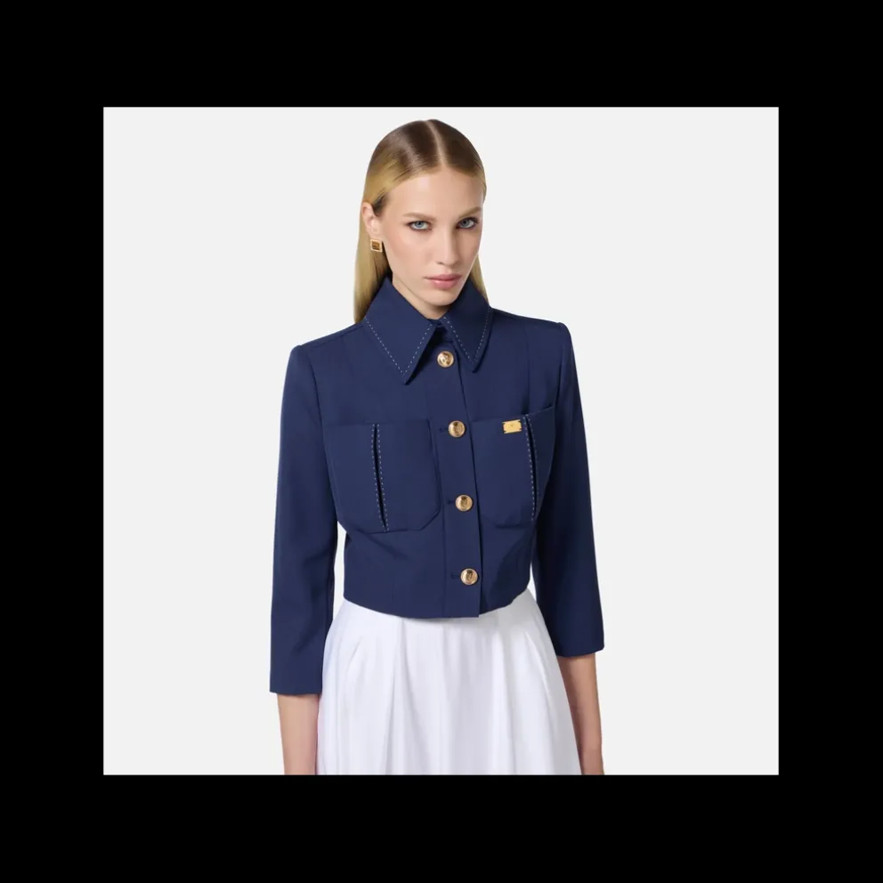 Jaqueta cropped de lã fresca com corte slim e mangas ¾. Gola e bolsos são definidos por pespontos contrastantes, há uma pequena fenda central nas costas. Botões e uma placa de logotipo de metal dourado iluminam a frente.