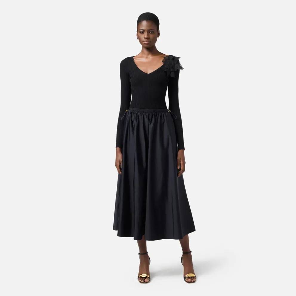 Saia circular em tecido técnico voile com corte regular. O destaque está na cintura que é definida por um cordão com franzido e iluminada por detalhes do logótipo em metal dourado que funcionam como fecho de cordão.