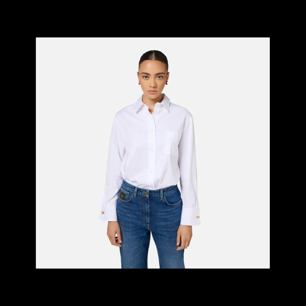 Camisa de manga comprida às riscas em popelina com botões de punho com logótipo em metal dourado. Possui bolso no peito.