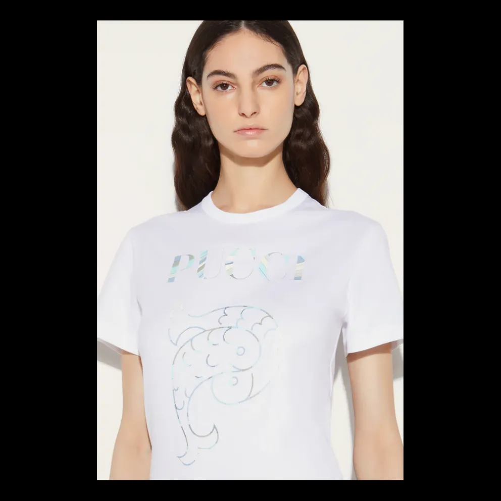 O apelido de Pucci e o logótipo do peixe entrelaçado animam esta t-shirt. São traçados com o estampado Iride em tons suaves de azul: uma homenagem às inspirações oceânicas da casa.