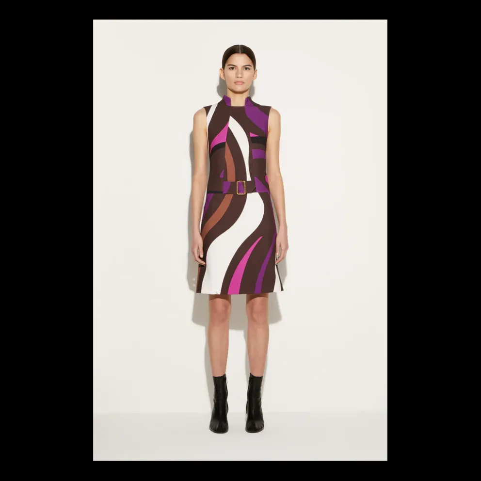 Este minivestido encapsula o maximalismo geométrico da maison Pucci: a paleta retro é filtrada por uma lente contemporânea, como demonstra o estampado Marble, dividido e revisitado em proporções máximas. A fivela dourada na cintura