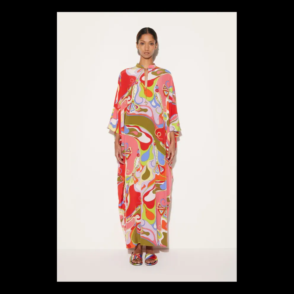 Este kaftan de seda destaca o venerado jogo de estampados da Pucci. A silhueta fluida é decorada com as linhas psicadélicas do estampado Orchidee, enquanto o decote auto-amarrado é pontuado por pingentes de peixe entrelaçados.