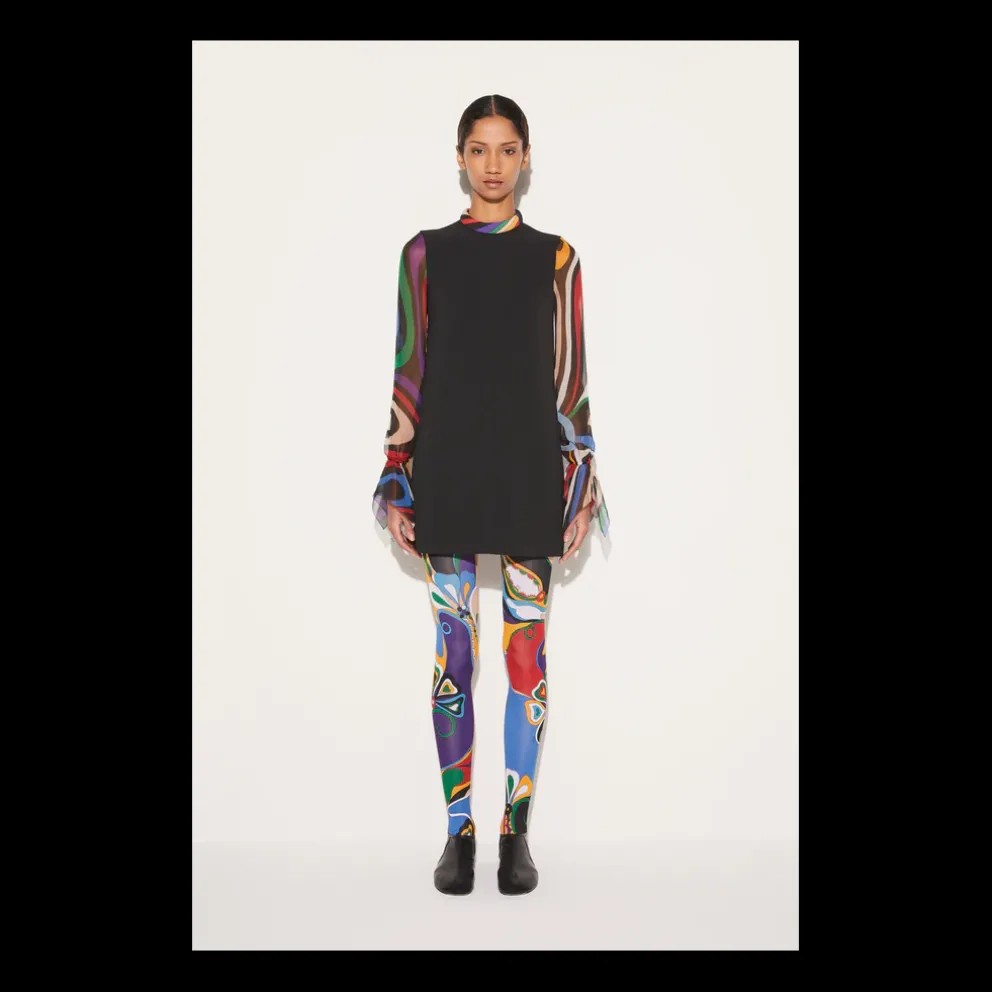 Apresentando a direção contemporânea da Pucci, este vestido combina alfaiataria com gráficos icónicos e elementos românticos. É cortado em cady com mangas semitransparentes com estampado Marmo e punhos de lenço caprichosos.