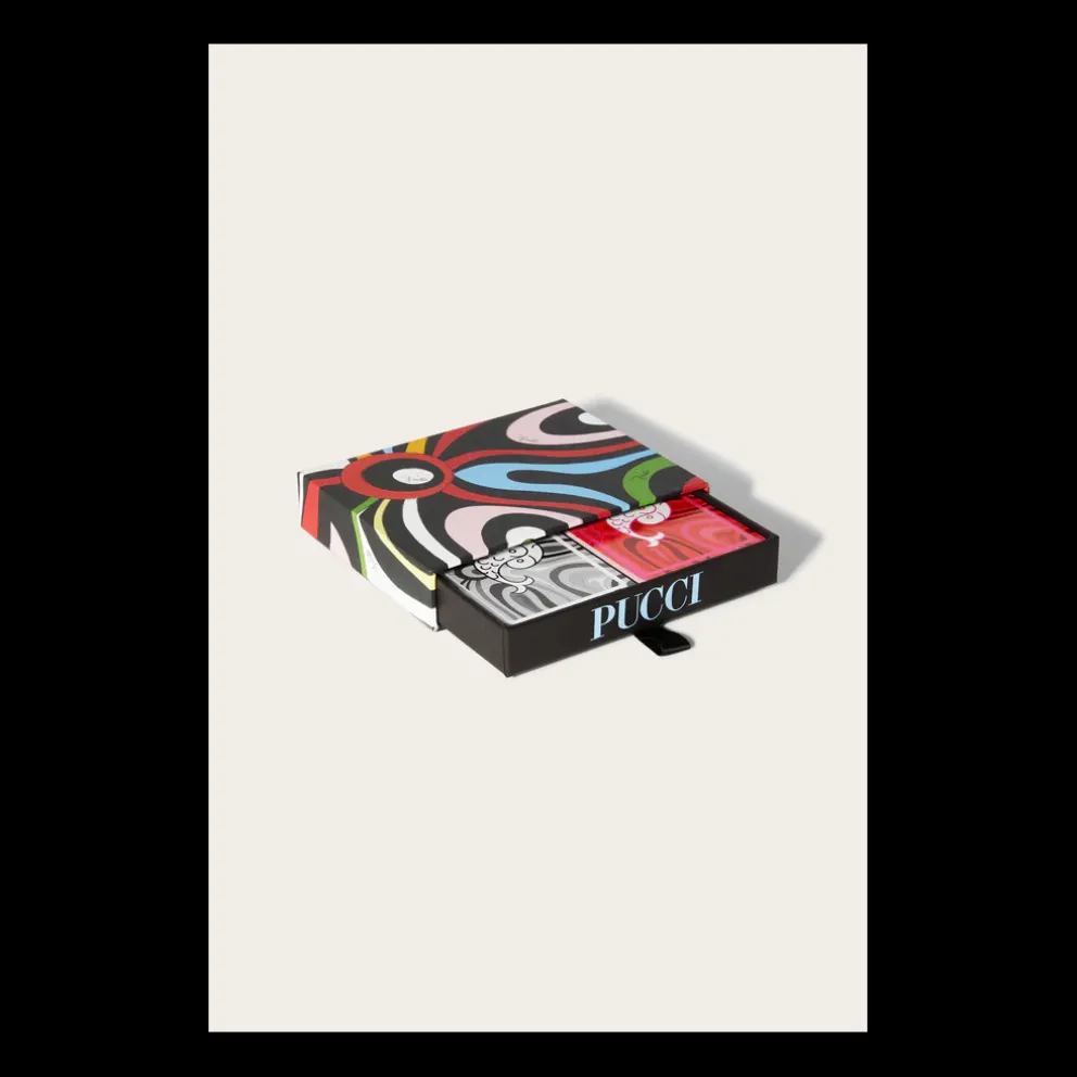 O estampado Marmo da Pucci dá um toque animado a este conjunto de cartas de baralho. Complementando o padrão inspirado no mármore, o logótipo Pucci P estampa o deck