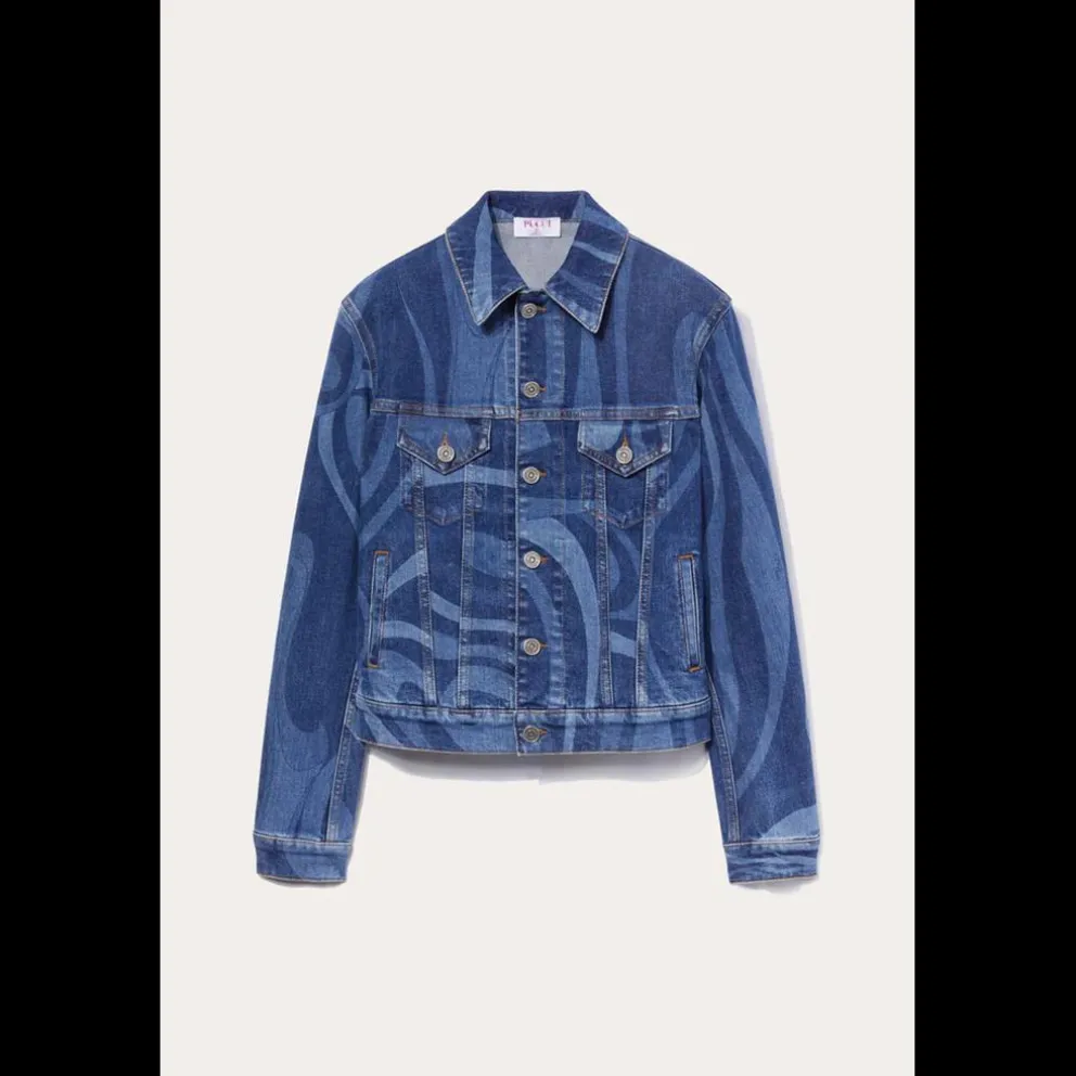 Um design clássico elevado com a perspectiva estampada da Pucci: esta jaqueta é estampada com a estampa Marmo em tom azul. É decorado com costura tradicional de calêndula e finalizado com um logotipo na bainha.