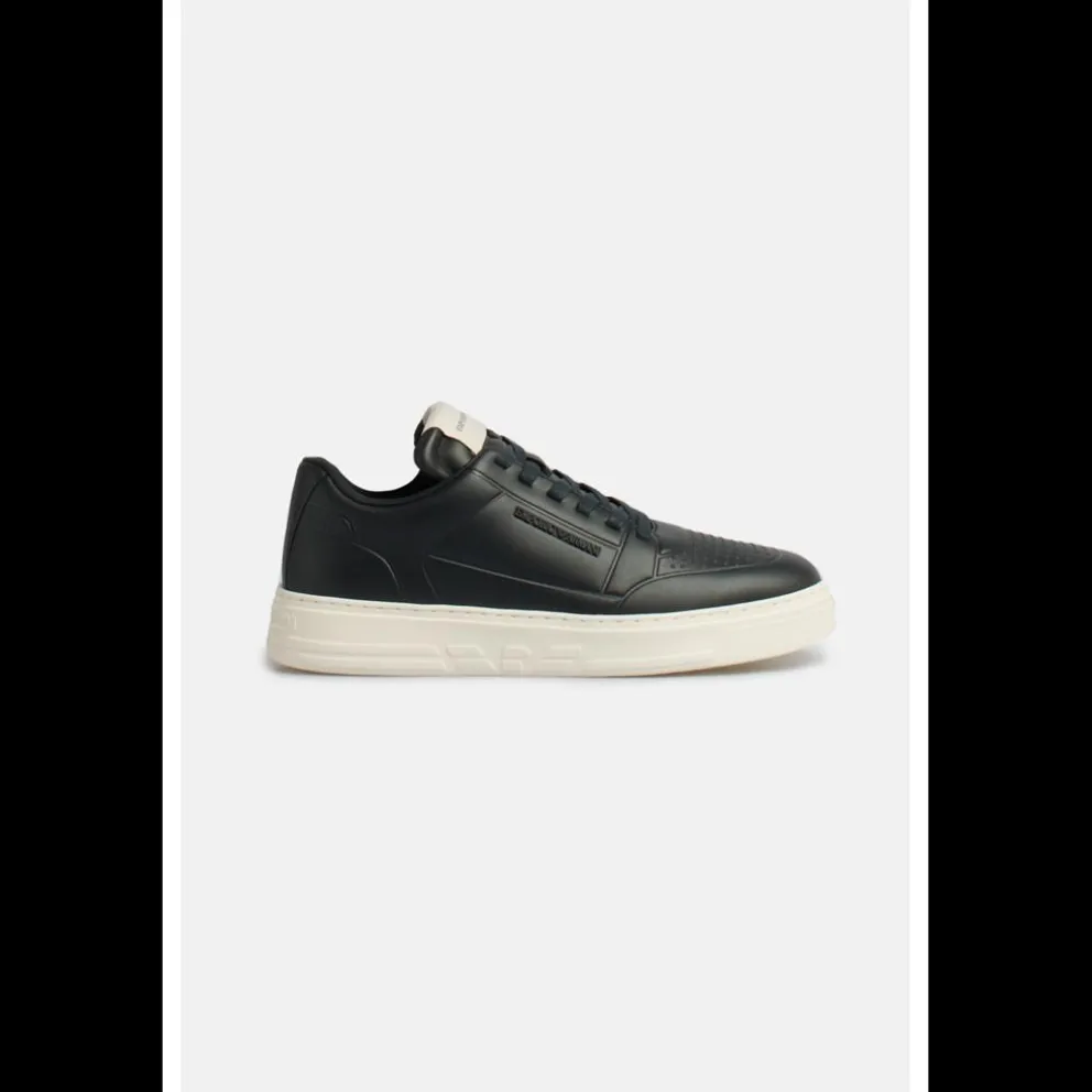 ténis emporio Armani fabricado em pele, atacadores planos em algodão, logotipo na frente, costas e lateral, bico redondo, sola em borracha, detalhe de pontos em relevo