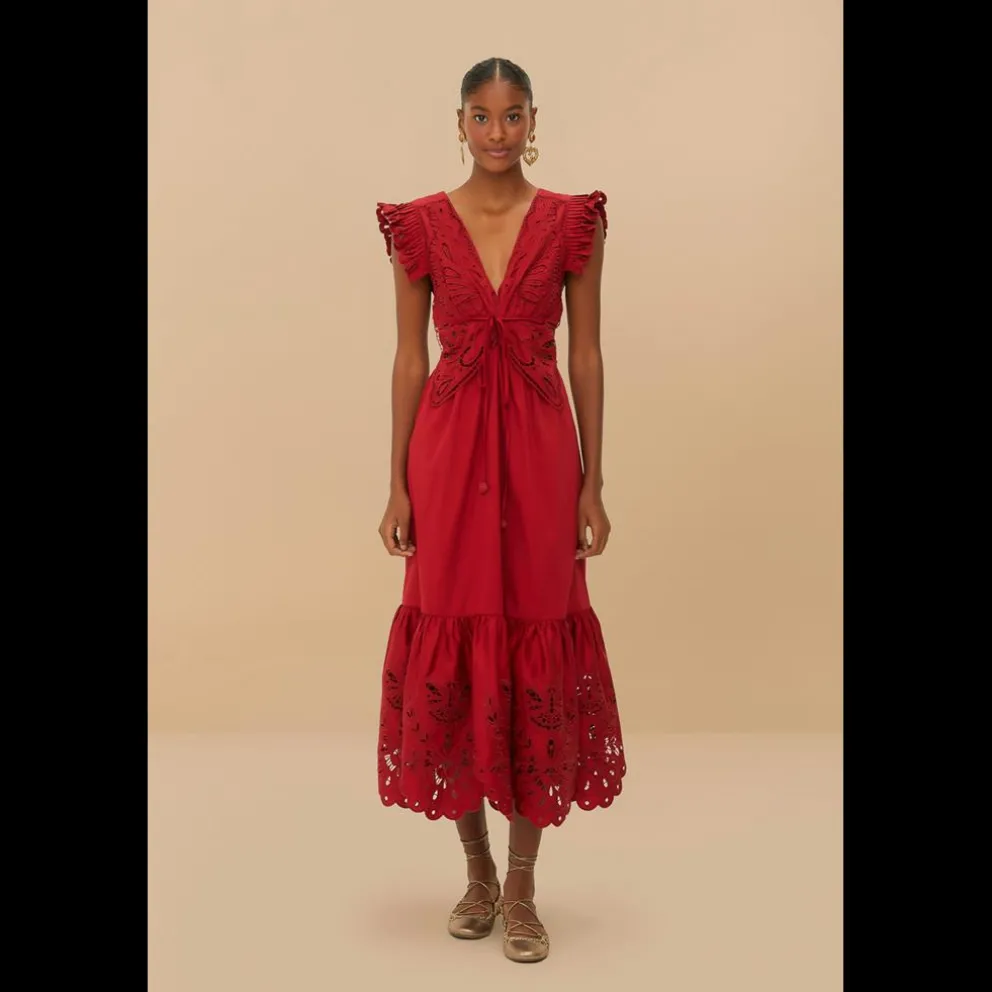 Abrace o espírito vibrante do Brasil com o vestido midi vermelho com recorte borboleta da FARM Rio. Esta peça encantadora apresenta um divertido estampado de borboletas que dança numa silhueta fluida, lindamente acentuada pelo seu elegante decote