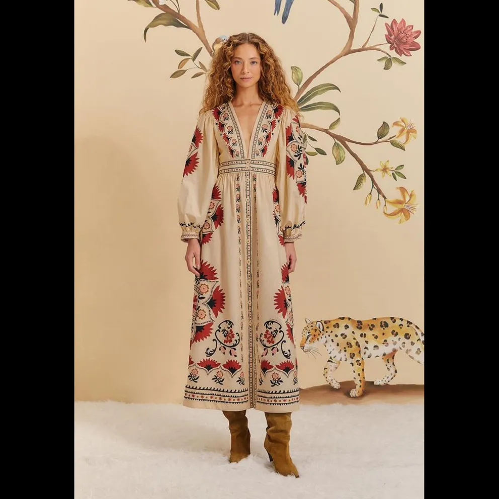 Abrace a mistura harmoniosa de tradição e modernidade no vestido comprido Mandala Cream Cashew. Esta peça celebra um decote em V único, enquanto a sua silhueta que vai até ao chão é adornada com padrões vibrantes inspirados em mandalas
