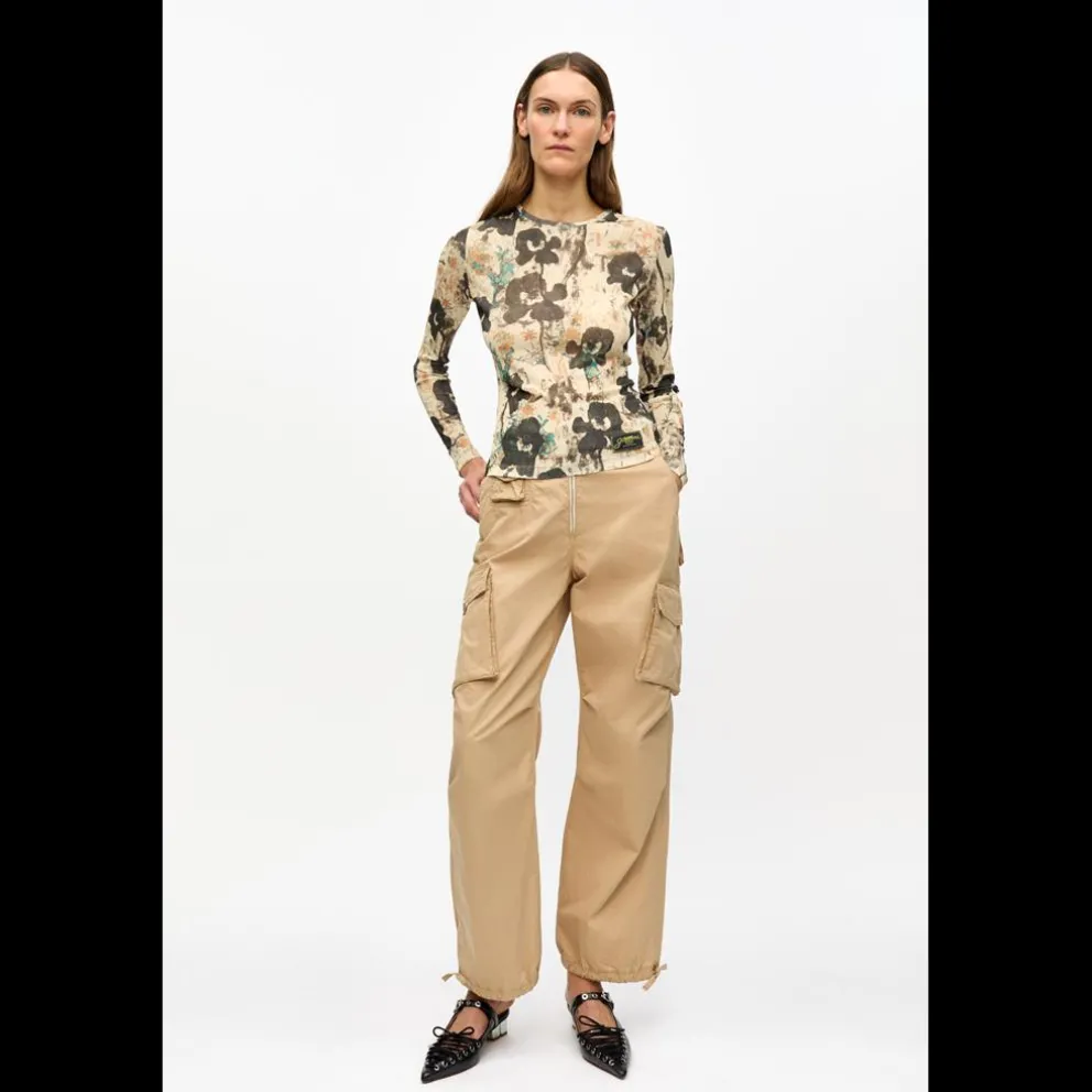 Estas calças de sarja de algodão lavadas em tom camel apresentam presilhas para cinto, fecho de correr e botão, um pequeno bolso frontal, dois bolsos cargo laterais, bolsos traseiros e cordão nos tornozelos.