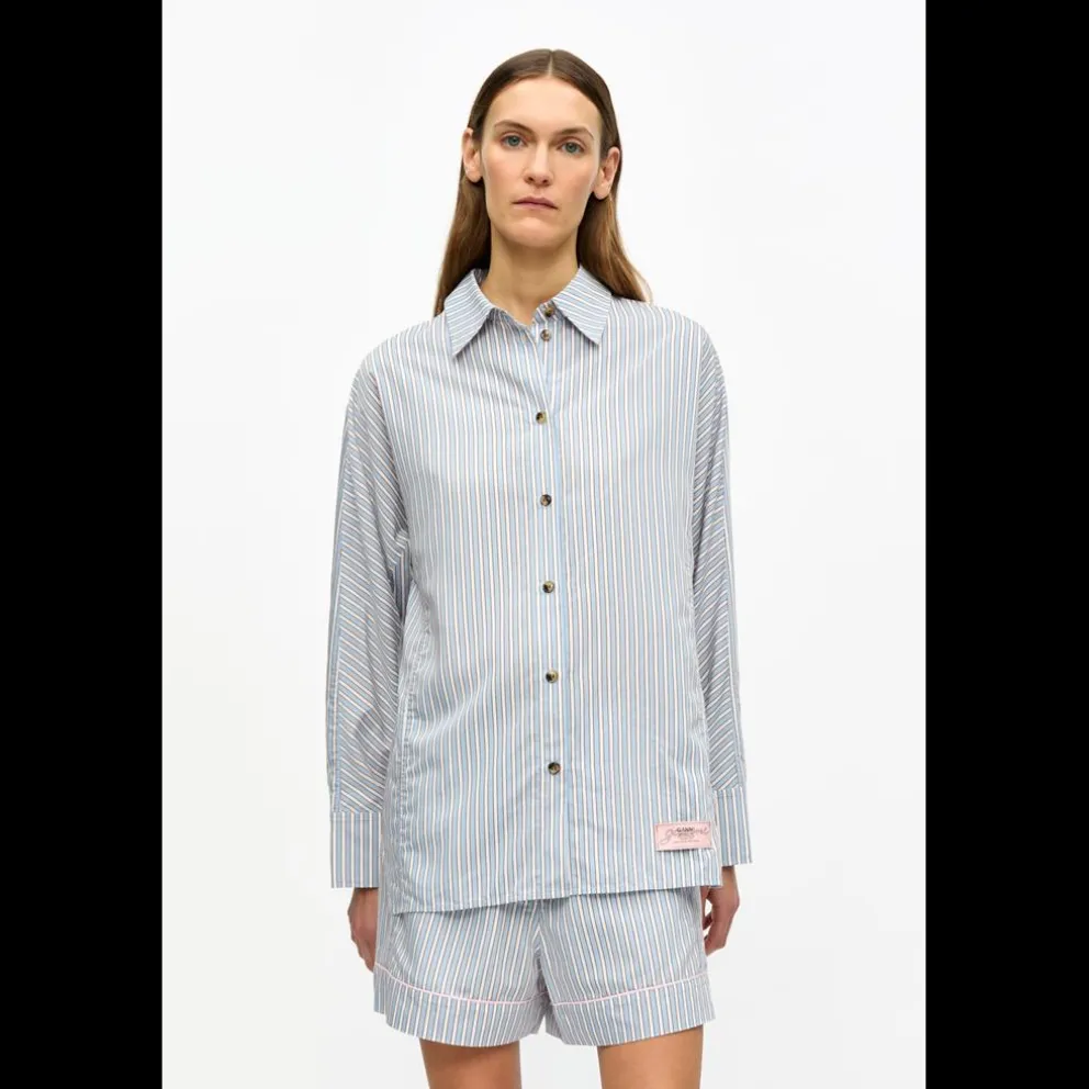 Esta camisa às riscas Candy apresenta gola, fecho de botões na frente, mangas compridas e um logótipo da GANNI costurado.