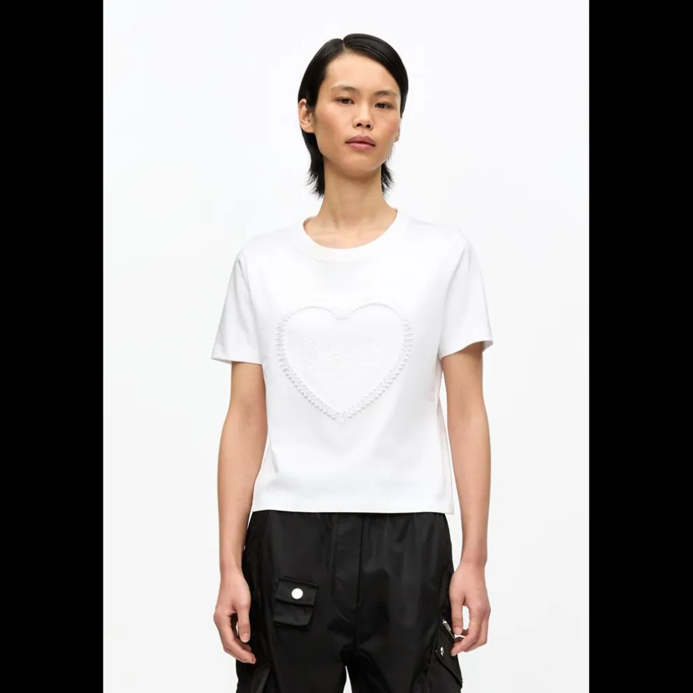 Esta t-shirt branca de algodão pesado com coração apresenta uma gola redonda, mangas curtas, um coração bordado com o logótipo da GANNI e a frase “Have a nice day!” Por favor, recicle.’