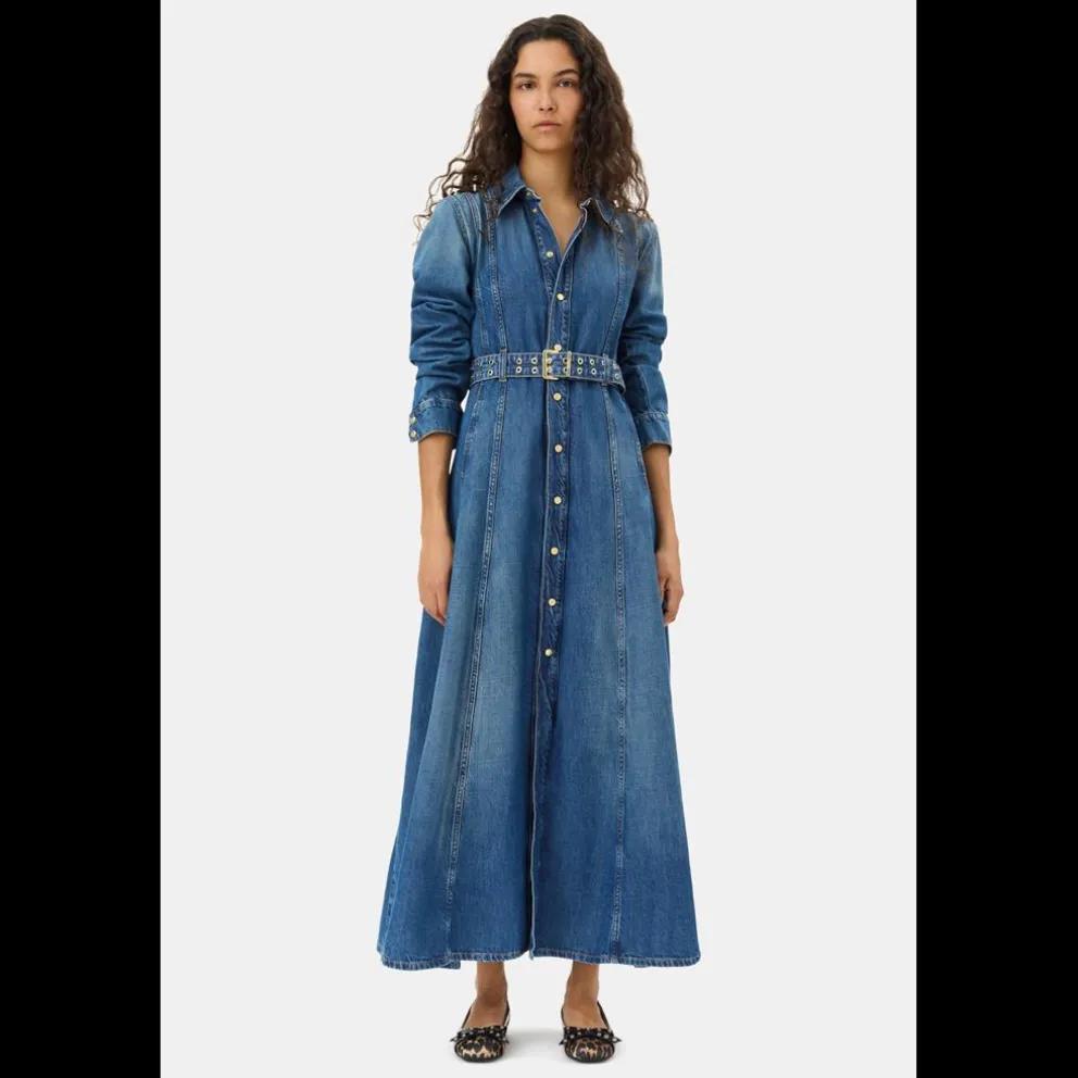 Este vestido comprido de ganga azul escuro tem uma gola pontiaguda e um fecho frontal com botões que percorre todo o comprimento do vestido. Possui mangas compridas com punhos abotoados e acompanha um cinto com ilhós dourados que marca a cintura.