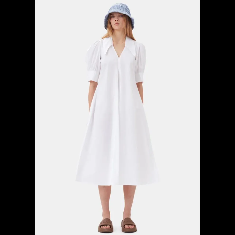 Este vestido midi de popelina de algodão com decote em V é feito de algodão orgânico e foi concebido para um ajuste justo no busto. O vestido tem decote em V, gola, mangas abalonadas, punhos abotoados, bolsos laterais e pregas à frente e atrás