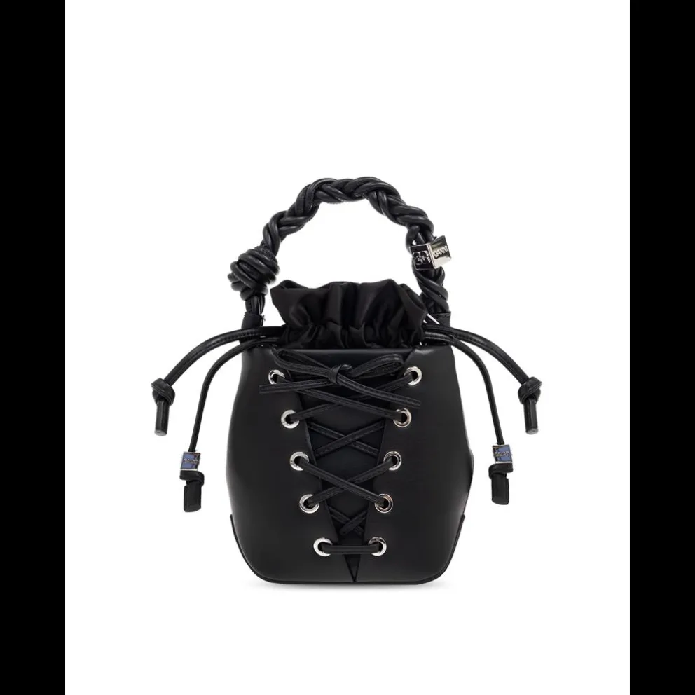 Apresentamos a mala preta da coleção exclusiva da marca de luxo GANNI, que combina subtilmente o design moderno com a elegância clássica. Altura: 15cm. Largura no ponto mais largo: 16 cm. Largura inferior: 9cm