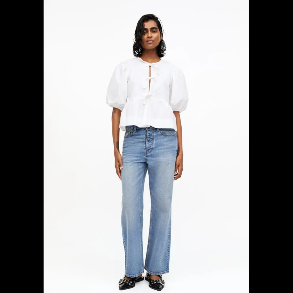 Estes jeans em lavagem azul claro apresentam fecho de correr e botão, 5 bolsos, presilhas para cinto, logótipo GANNI no bolso traseiro e detalhe de cinto.