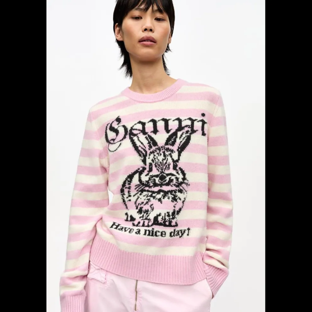 Esta camisola de lã com estampado de coelho às riscas apresenta gola redonda, mangas compridas, bordas caneladas, estampado gráfico GANNI e logótipo GANNI.