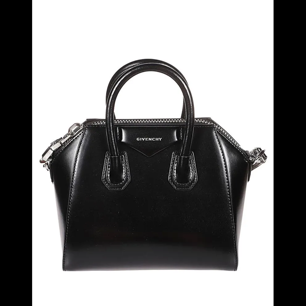 Bolsa Antigona da GIVENCHY em pele lisa preta com alças, alça de ombro em pele ajustável e removível, ferragens prateadas e fecho de correr.